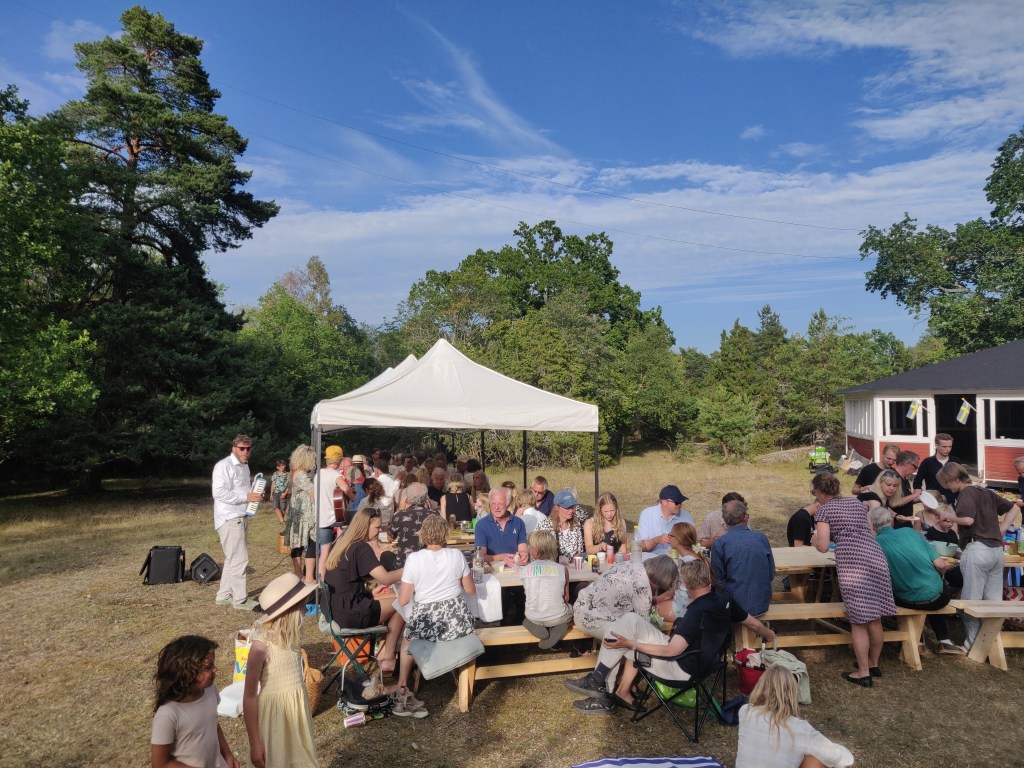 I härligt sommarväder mötte ett stort antal skärgårdsbor upp den 25 juni, för att fira det omlagda taket på dansbanan på Kättilö. Redan när de första glada deltagarna dök upp för att snickra ytterligare några bänkar och bord fanns de kanske viktigaste medhjälparna på plats och putsade gräset runt dansbanan. Efter en trevlig promenad med kluriga frågor, god mat och hjärtlig sjungande intogs dansbanan där vi under ledning av Jonas och Monne introducerades till ett flertal traditionella skotska danser innan det blev dags för friare dans. Vi riktar ett särskilt tack till familjerna Nilsson Fagerberg och till alla Kättilöbor som så generöst bjöd till för en fin fest.